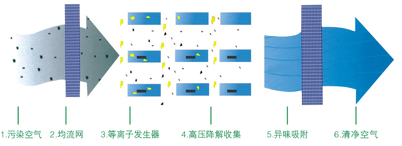采用低温等离子体分解油雾、废气等污染介质时,等离子体中的高能离子起决定性的作用。流星雨状的高能离子与介质内分子(原理)发生非弹性碰撞,将能量转化成基态分子(原子)的内能,发生激发、离解、电离等一系列过程使污染介质处于活化状态。污染介质在等离子体的作用下,产生活性自由基,活化后的污染物分子经过等离子体定向链化学反应后被脱除。当离子平均能量超过污染介质中化学键结合能时,分子链断裂,污染介质分解,并在等离子发生器吸附场的作用下被收集。在低温等离子体中,可能发生各类型的化学反应,这主要取决于等离子的平均能量、离子密度、气体温度、污染物介质内分子浓度及共存的介质成分。